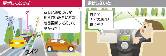 | 新規開通道路が収録されていないと、適切なルート探索ができず、大回りをして燃料と時間の無駄が出てしまう場合があります。また、ルート探索を使用しないときでも、地図と実際の道路が異なっていると、交差点で慌てたり、進行方向を間違えたりすることがあります。 | ![]() |